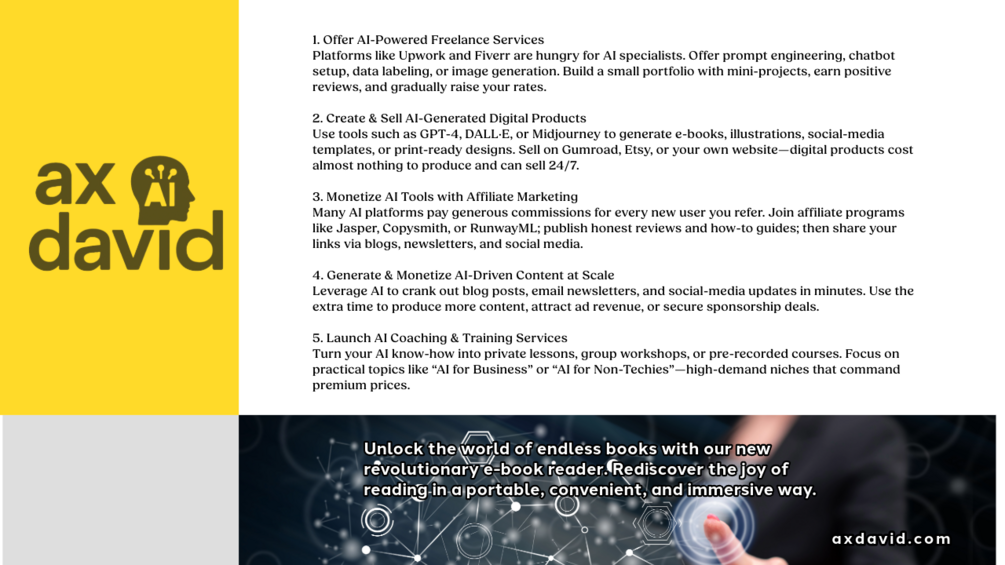 This guide lays out five actionable paths to profit from AI—freelance services, digital products, affiliate marketing, scaled content creation, and coaching—each requiring minimal startup costs and leveraging popular tools like GPT-4 and DALL·E. Pick the approach that suits your skills, master the necessary AI platform, and begin executing today to turn your expertise into income.